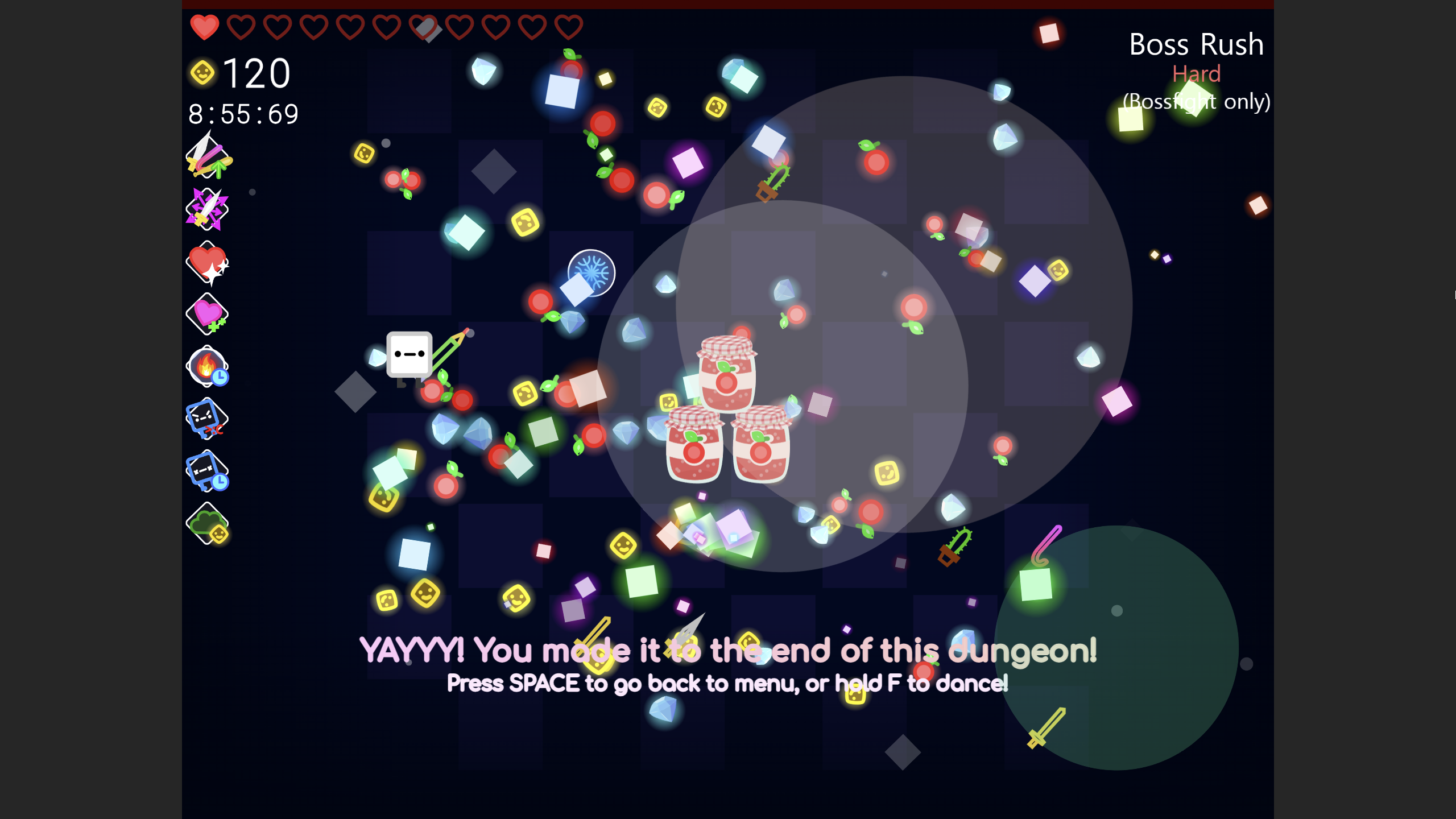 This game is a 2D Roguelite with randomly generated rooms, and a variety of skills to improve the way you swing those sticks. Every dungeon ends with a bullet hell bossfight!